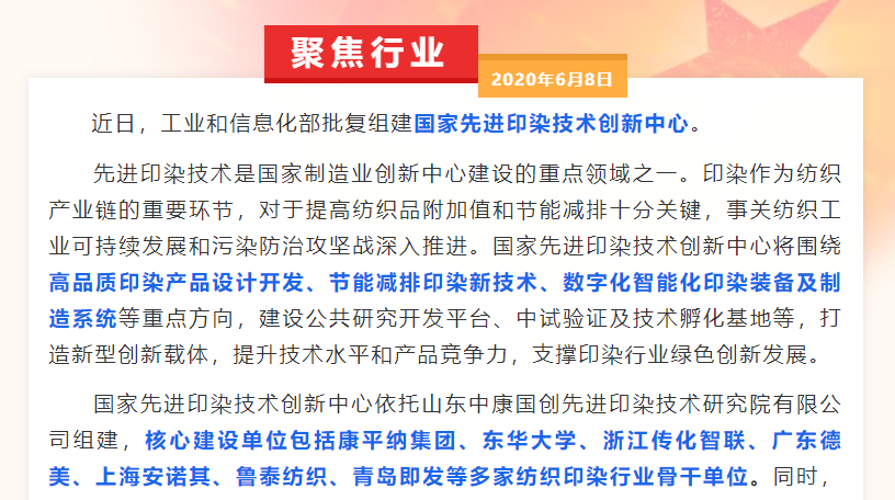 【聚焦】工业和信息化部批复组建国家先进印染技术创新中心