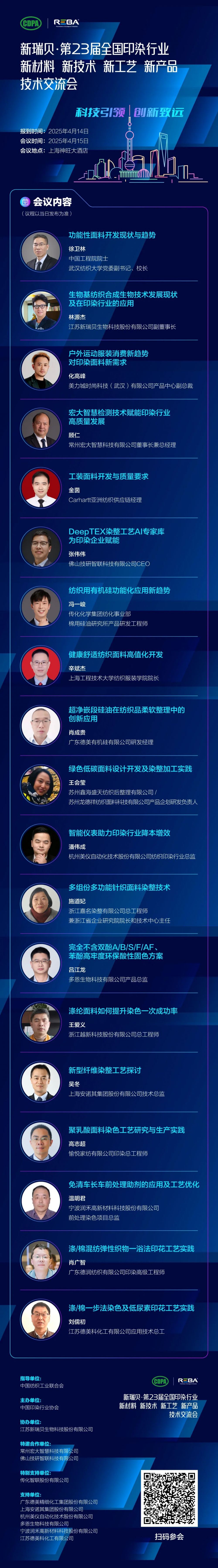 科技创新是发展新质生产力的核心要素,以科技创新引领新质生产力发展和现代化产业体系建设是提高发展质量和效益的重要抓手。为进一步发挥科技创新作为引领印染行业高质量发展的第一动力,促进科技实力大幅跃升,形成推动行业高质量发展的有力支撑,中国印染行业协会将于2025年4月14-15日在上海召开“新瑞贝·第23届全国印染行业新材料 新技术 新工艺 新产品技术交流会”。